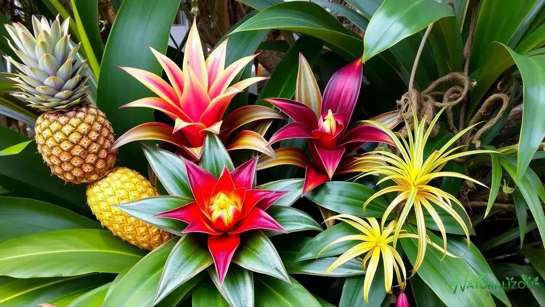 A espécie Ananas comosus é famosa por seu fruto comestível, o abacaxi, e tem folhas rígidas e espinhosas. Já as bromélias ornamentais, como a Vriesea e Guzmania, apresentam folhas mais largas e flores vibrantes que duram bastante tempo.