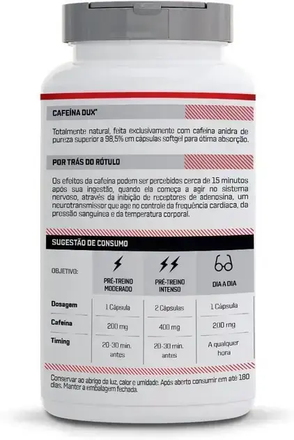 É recomendado tomar uma cápsula de Cafeína Dux antes do treino ou em momentos que precisar de um aumento de energia.