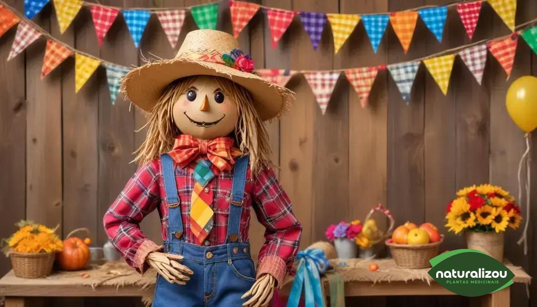 Como fazer espantalho para festa junina passo a passo envolve montar uma estrutura de madeira, rechear com palha, vestir com roupas coloridas típicas e decorar com acessórios festivos para criar um elemento que valorize a decoração e possa ser reutilizado em outras festas.