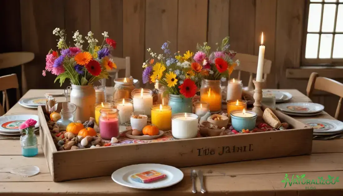 Além disso, aposte em elementos naturais que muitas vezes já temos em casa, como galhos secos e pequenos vasos com flores do campo. Itens reciclados, como potes de vidro transformados em velas, têm grande efeito visual e são econômicos.