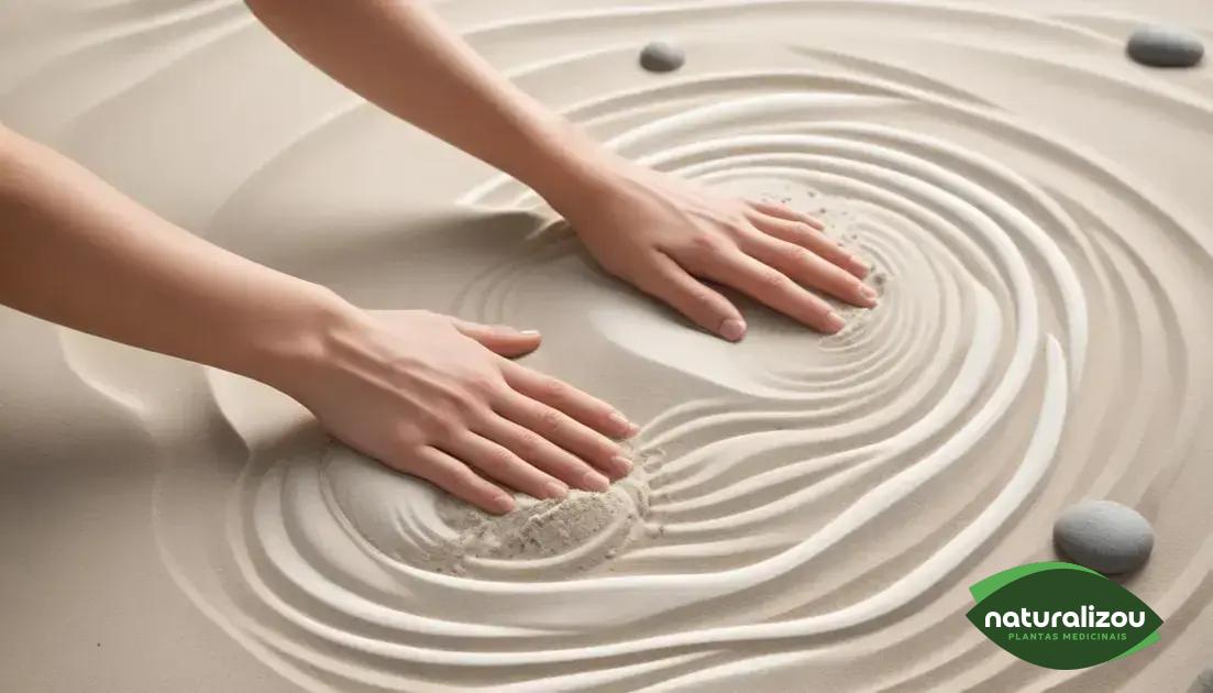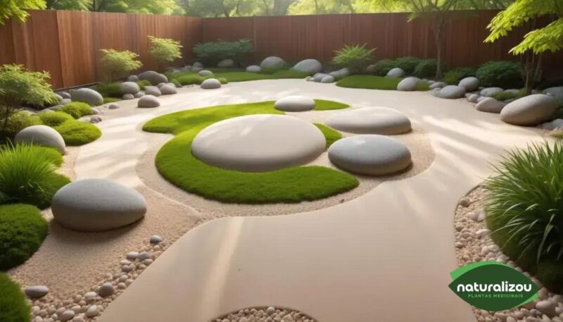 Elementos essenciais incluem pedras que simbolizam montanhas, areia ou cascalho representando água, e plantas minimalistas como musgos ou bonsai, para um toque de verde.