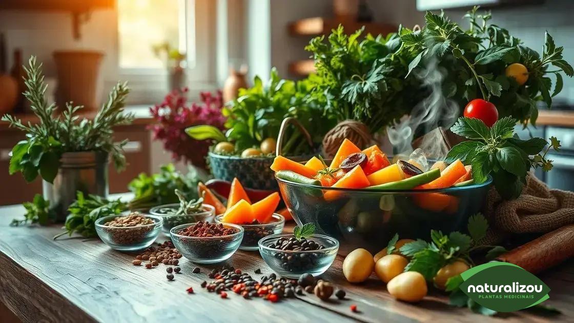 As ervas frescas são perfeitas para realçar a leveza dos legumes cozidos. Experimente adicionar salsinha e cebolinha picadas no final do cozimento para um toque clássico e fresco. O tomilho e o alecrim, com seus aromas mais intensos, combinam muito bem com legumes assados ou cozidos no vapor, como batata e cenoura. Manjericão fresco picado é ideal para pratos com tomate e abobrinha, adicionando um toque adocicado e vibrante.