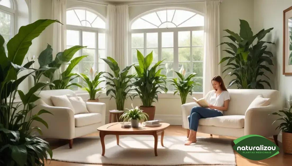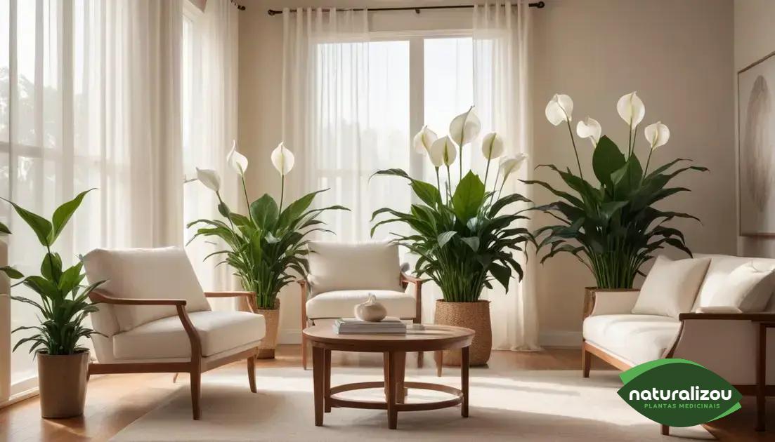 Lírios de paz purificam o ar, removendo toxinas, aumentam a umidade do ambiente, reduzem o estresse e são fáceis de cuidar, além de serem belas plantas decorativas.