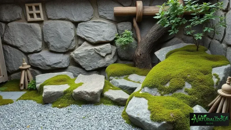 Use poucos elementos naturais, escolha materiais com aspecto envelhecido e permita que plantas cresçam de forma orgânica e irregular, criando um ambiente equilibrado e autêntico.